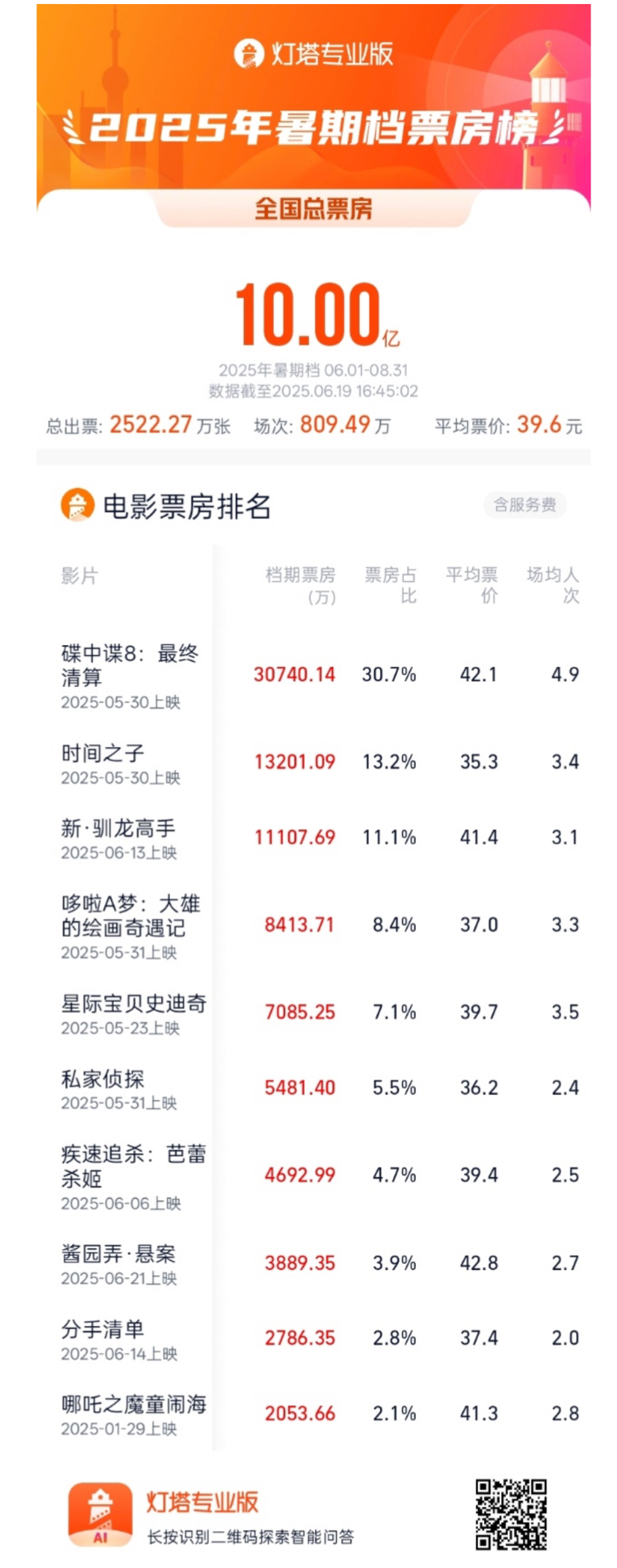 据灯塔专业版,截至6月19日16时45分,2025年暑期档(6月-8月)总票房(含预售)突破10亿,《碟中谍8:最终清算》《时间之子》《新·驯龙高手》《哆啦A梦:大雄的绘画奇遇记》《星际宝贝史迪奇》暂列票房前五名。