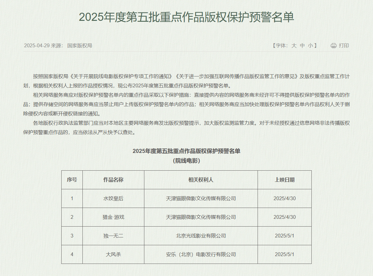 1905电影网讯 据国家版权局4月29日消息,2025年度第五批重点作品版权保护预警名单公布:《水饺皇后》《猎金·游戏》《独一无二》《大风杀》四部影片在列。