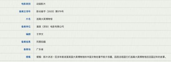 新浪娱乐讯 据国家电影局关于2023年8月上全国电影剧本(梗概)备案、立项公示的通知,王学文担任编剧的《逃离大英博物馆》立项。影片讲述一百多年前流落英国大英博物馆的中国文物在春节前夕苏醒,因思念祖国它们逃离大英博物馆后回国过年的故事。