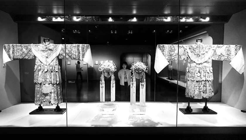走进展厅,每一件展品都熠熠生辉,吸引众人驻足欣赏。《霸王别姬》单元展示的“虞姬剑舞衣”“粉缎绣牡丹绶带鸟楚宴衣”“黄缎绣牡丹绶带鸟楚宴衣”,件件颜色搭配讲究,做工极其精美,充分体现了中国戏曲服装色彩运用之美。